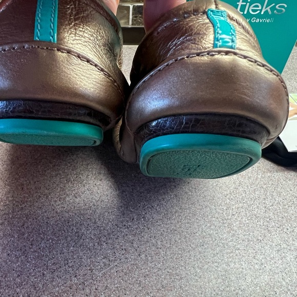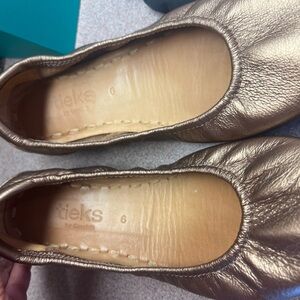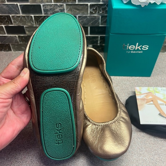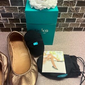 Tieks Ballet Flats Metallic Bronze Size 6. Comes with original box, flower, 2 tote bags,2 storage bags, and booklet. Excellent condition, Minimal ware, see photos as part of the description.