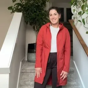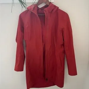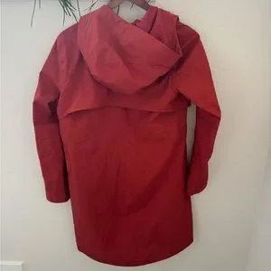 This long women’s rain jacket is perfect for season transition. The rust color is two seasons old barely worn like new condition.