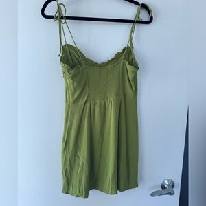 Wear this. This is a bustier mini dress with a sweetheart neckline, adjustable tie straps and a smocked back panel. It's made from drapey crepe fabric with a subtle pebbled texture.