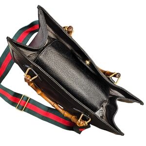 This is an authentic vintage leather Diana bag made by Gucci. It's in beautiful condition. The exterior is in great shape. The stitching and edging are in great shape. The hardware is also in nice condition, especially for its age. There are a couple of blemishes where the bamboo handle hits the bag, but they are not noticeable at all (see photos). There is also a scratch across the bottom of the bag (see photo). The interior was flaking. All of that has been removed down to the felt lining, so the inside is very clean with no vintage odor. The unbranded striped crossbody attachment is included. The Gucci dust bag is included for storage. Offers are highly encouraged, and I am open to trying to offset the new buyer service fee. Thank you for looking!
