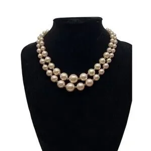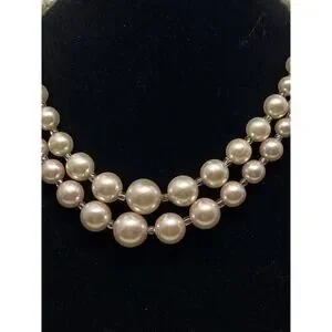 Heritage 50s Faux Pearl w/ Clear Divide Beads Necklace Double Strand 15" Grandma. Heritage style as an accessory for feminine yet independent outfit. Vintage strand from the 50s with a chunky style choker that is adjustable. Wear with suits for Retro Corpcore style. Easy to style Grandmacore with sweaters. Hook adjustable closure. Vintage timeless strand with a vogue 50s look.