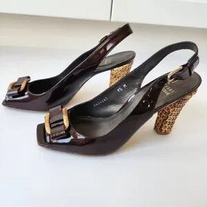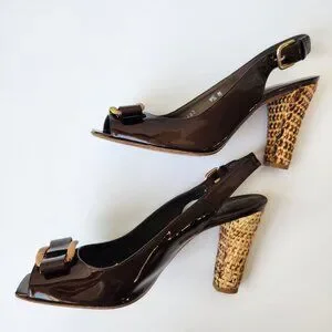 Stuart Weitzman Brown Patent Leather Slingback Heels Woven Block Heel Bows 9.5 M
