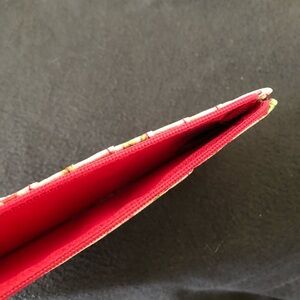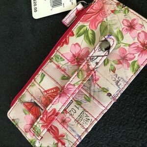 Brand new. Holds ID, 6 charge cards, with zipper section for cash and another open pocket for storage. Measures 6.75” long x 3.25” tall.