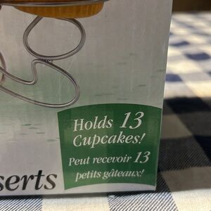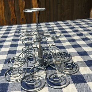 Wilton’s cupcakes’ N More dessert stand. Holds 13 cupcakes on this bold silver coated wire spirals to securely hold each cupcake. Great way to display your cupcakes. New just got out to display the stand.