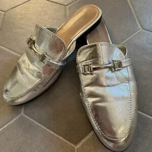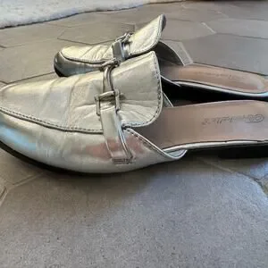 Women's Metallic Silver Loafter Slides with Silver Buckle and Pointed Toe