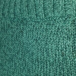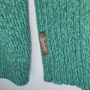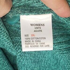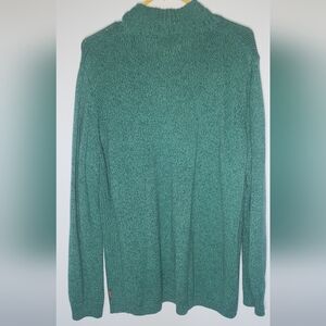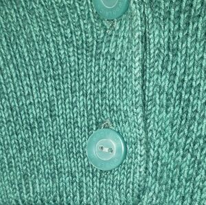 This green sweater is 100% cotton with button details at the collar. Very warm. No flaws.