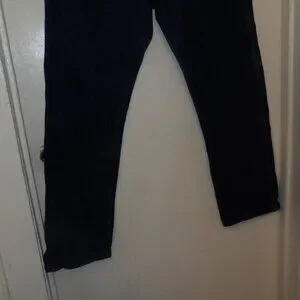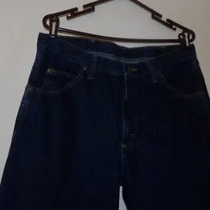 darker blue wash no distressing , good pre owned condition no holes stains or distressing & minimal wash wear, Waist 35 inseam 30" regular fir straight leg , 100% Cotton , 5 pocket style with belt loops, button zip fly, pet friendly non smoking home.