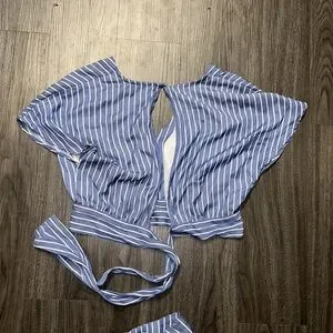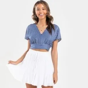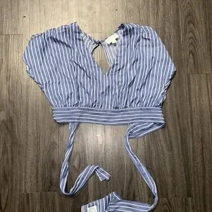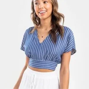 June & Ivy Blue Striped Cropped Cap Sleeve Blouse- Size Medium
