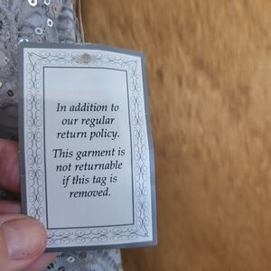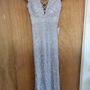 New with tags. B. Darlin silver sequined fitted formal gown with v cut strappy front and back, banded bodice, 1/4 zip back, and inner lining. Size 3,4