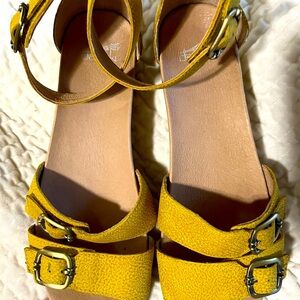 Very cute and comfortable sandal with ankle strap and low wedge. Very lightly worn but there is some damage/ discoloration to the back of the shoe because of how I stored them.