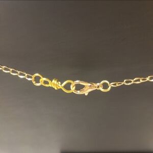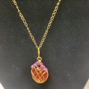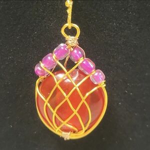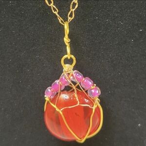 This necklace is handmade by me. It's a Gold Wire Wrapped and Red Stone Lotus Bud Style Necklace. The necklace has one big red glass stone and six smaller 3mm beads. The gold chain is 20-1/2" long and has a gold lobster 🦞 clasp.