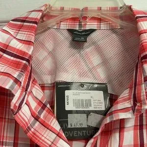 New with tags Eddie Bauer women’s button up shirt Has button on sleeve to roll up sleeves to change length. Reddish orange color with burgundy stripe