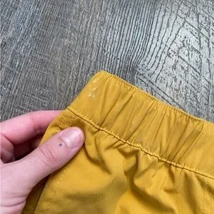 Mustard color with blue adjustable belt. Has a slight bleach stain (pictured) but still in great condition! Love love love these shorts, sadly they don’t fit me anymore.