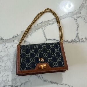G G wallet crossbody purse clutch denim gold can double loop chain so can wear as a shorter shoulder bag. I’m not sure on where it’s from since I buy cute stuff off my girlfriend second hand so please keep that in mind with the price and that I can’t guarantee if it’s from the actual store or not. So cute and goes with everything. I never got a chance to use this one since I have a different denim bag that was a little bigger so I kept grabbing that one… need to downsize so selling. Key clasp inside and attached card case.
