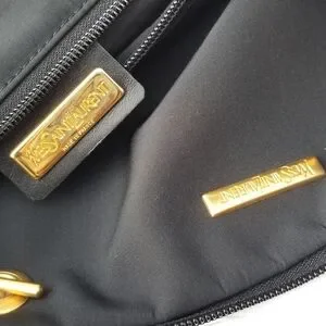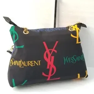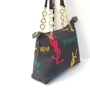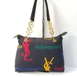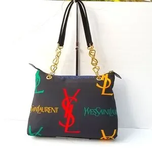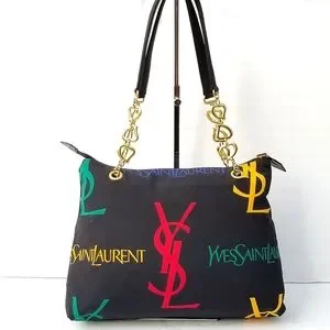 Features Black canvas with monogrammed "YSL" and "Yves Saint Laurent" in yellow, green and red (the brand's colors). It is worn on the shoulder with two handles. The jewelry is matte gold.