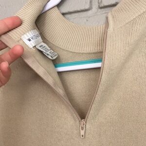 Great condition super soft acrylic sweater in a beautiful creamy tan. Very cozy fall sweater. Has a zipper at the back of neckline. White Stag closet staple piece.