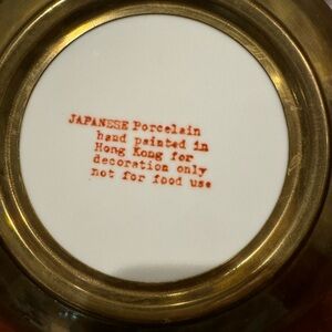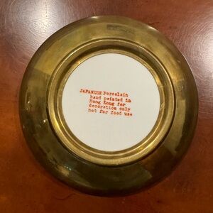 Sweet decorative, porcelain, bowl with hand painted design and what I believe is brass rim and underneath. Measurements are approximately 7.5” in diameter and 1.5” tall. Makes a great accent piece or a catch all for change, jewelry…..Excellent condition.