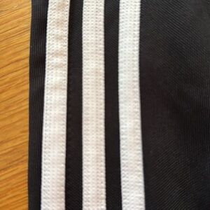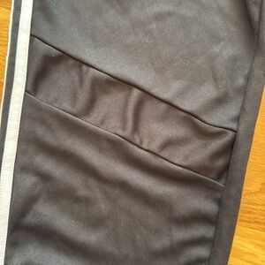 Adidas size women’s Large black track pants with three white stripes. These pants are very black unlike some of the photos that show them as gray.