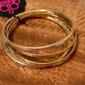 Encrusted in sections of glittery white rhinestones, a mismatched collection of sparkly, smooth, and textured gold bangles stylishly stack up the wrist for a standout look.