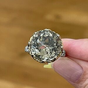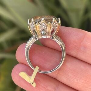 This is an absolutely gorgeous genuine / natural lime citrine quartz with white zircon accent solid sterling silver size 7.0 ring. The center stone is large and highly cut. It sparkles beautifully under the spotlight. The ring mount is gold plated to make the floral motif. New with tag label.