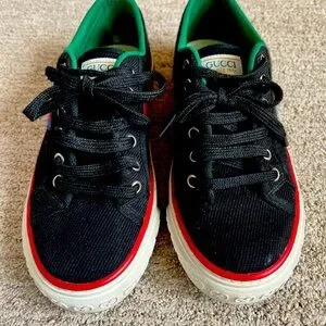 This is a pair of authentic Gucci sneakers. Black canvas with red and blue web striping.