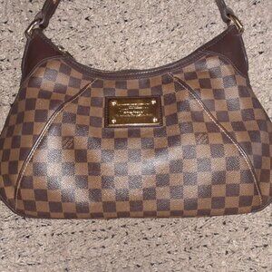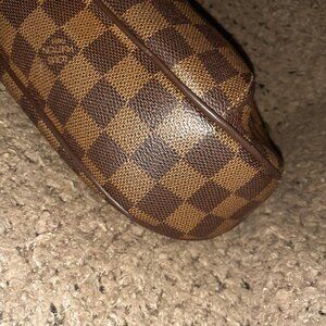 The bag features a beautiful damier check pattern and is made of coated canvas and leather.