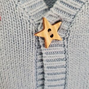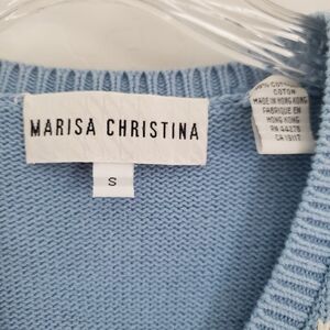 Vintage Marisa Christina Blue Sweater Vest. Size Small but runs very large...I usually wear a Large sometimes a Medium and this vest easily fits me. Used but I rarely wore it...LOOKS REALLY GOOD with Jeans. Star Buttons are wood.