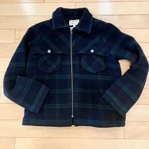 NEW CURRENT/ELLIOTT Plaid Shirt Jacket. Heavy wool felt fabrication with plush feel. Back features sewn in pleat for boxy look. Zipper closure in front. Two pockets with snaps. Hip level-24"long, 22" across. Size: 2 (Fitted Size Medium) 70% wool, 27% nylon, 3% polyester. Color: Deep Green/Blue plaid, Condition: NEW and UNWORN (no tags). Stored with care in a non-smoking, no pet environment.
