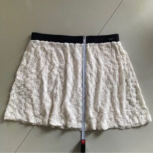 Never worn. Ivory lace fabric; fully lined. The waist is a thick fabric-covered elastic. Wearable for sizes 12 to 16, depending on where you wear it on your waist/hips!