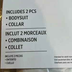 Brand new in package. Silver halter bodysuit with choker collar. The bodysuit has snap crotch closure.