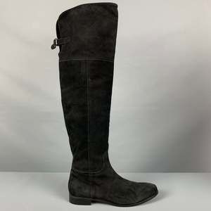 boots in a black suede featuring an over the knee style, buckle, and side zipper closure. Made in Italy.Very Good Pre-Owned Condition. Moderate signs of wear.