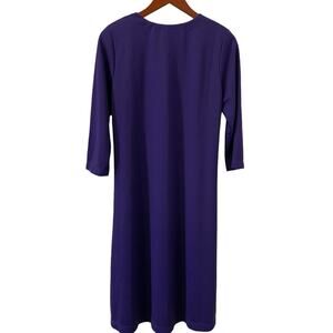 This Susan Graver dress is perfect for any occasion. The dress features a solid pattern with a beautiful purple color. The 3/4 sleeves and collarless design add a touch of elegance to the dress. The dress is made of a comfortable knit fabric that is a blend of polyester and spandex.