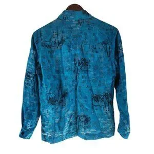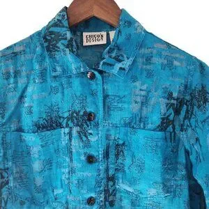 Chicos Rayon Blend Blue Teal Semi Sheer Asian Print Inspired Button Front Top 0