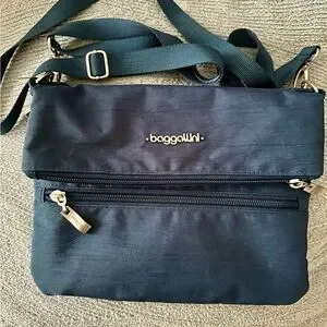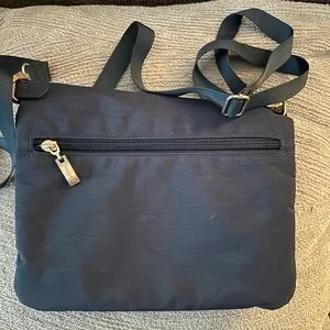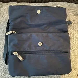*Solid dark blue nylon exterior material with silver hardware. Interior is a tan color. Light marks on interior.
