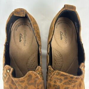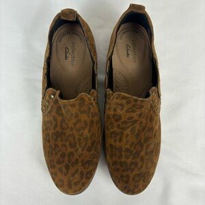 Clarks Trish Bell Loafers Leopard Print Suede Stud Accent Slip-On Shoes Size 7