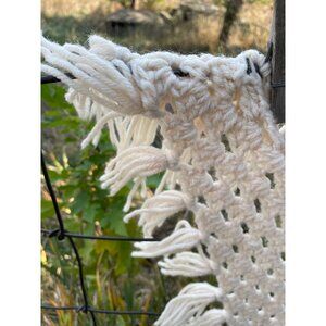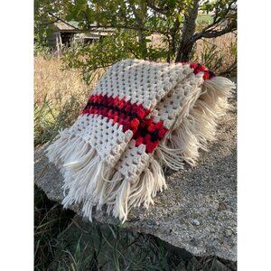 This vintage 1970s afghan blanket features a vibrant granny square design with fringe. Perfect for adding a retro touch to any room, it offers warmth and style. Ideal for cozying up on chilly nights or as a statement piece. This is made of sportweight acrylic yarn. It measures 61x61" including the fringe. It is clean and free of holes.
