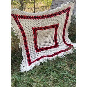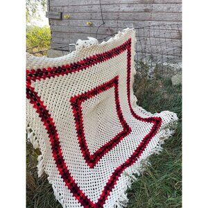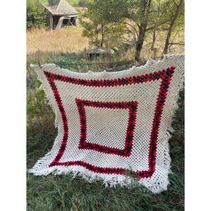 Vintage 1970s Large Granny Square Crochet Fringed Afghan Blanket