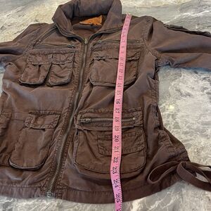 Twill 22 Twenty Two Jacket Womens L Brown Bomber Draw Strings Pockets Hood Y2K