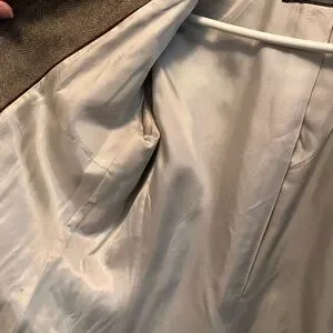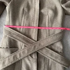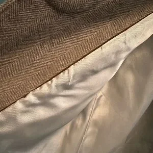 80% wool outer shell, polyester lining in a satiny cream color. No visible flaws. Very gently used.