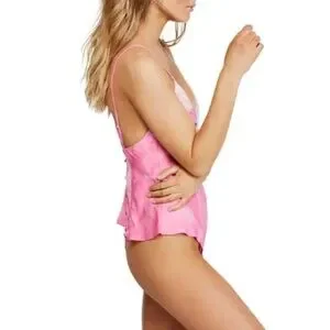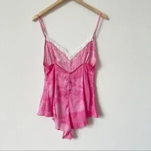 Lace along plunging neckline of a satin bodysuit that has bias-cut panels that flare along the hips - Deep V-neck - Adjustable straps - Back button-loop closure - Pink & beige Tie-dye print Lace trim -Satin construction -cotton lined gusset -Thong back