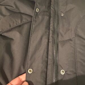 Classic parka styling with a full-length, center-front 2-way zipper and a covered placket for wind protection, secured with metal snaps