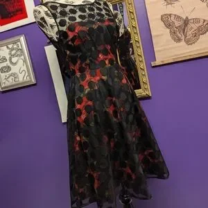 Betsey Johnson black polka dot and red floral dress. Sleeveless with sweetheart neckline. Gold zipper closure in back. Perfect for parties or weddings! size 2.