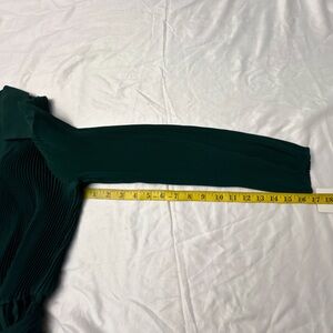 The dress is brand new. It was never worn. Pleated on the bottom. It is lined. Color is pine green