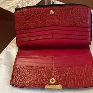 Beautiful Burberry embossed leather wallet. Gently used, amazing condition. Zipper works perfectly, no coin residue at all. 12 slots for credit cards. Snap is perfect. Color is more like a deep burgundy reddish ( picture is more warm) 7 by 4.5 measurements