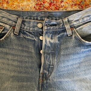Super cute distressed Levi’s 501 jeans with button fly. Love the raw hem at the leg opening detail. 5 pocket. Also has a very cute darker blue denim detail on the sides