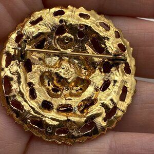 Vintage unmarked pink crystal & faux pearl gold tone brooch. This 1.5in lapel pin adds a touch of sparkle to any outfit with its unique design.