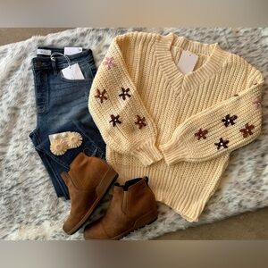 Ivory white cable knit v neck floral embroidered sleeve boho bohemian sweater