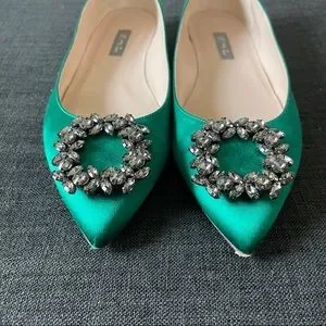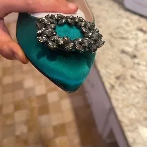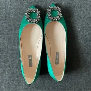 Only worn a few times, were just a little big on me. Beautiful emerald green SJP Divine flats! Comes with box. See wear on soles- leather has peeled slightly on left tip but could be either snipped or glued back on. A few small catches on sides. Not noticeable when on!
