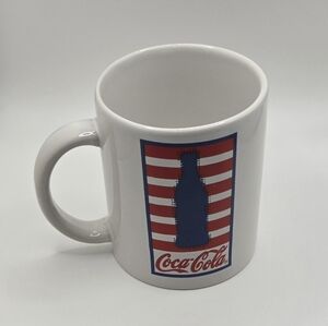 This Coca-Cola coffee mug is a perfect addition to any collection. With its patriotic design featuring blue bottles and red and white stripes, it's sure to catch your eye.
