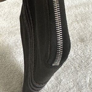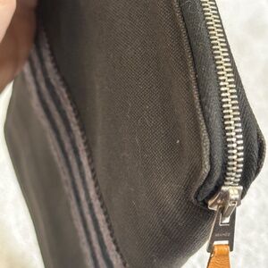 Hermes 'Fourre Tout PM' Zippy Wallet in black cotton canvas. Striped trim canvas around the wallet. Zip closure. Black fabric lining. 3 open pockets and coin compartments with snap button. Very roomy with plenty of room for phone, keys, credit cards, money, and much more!